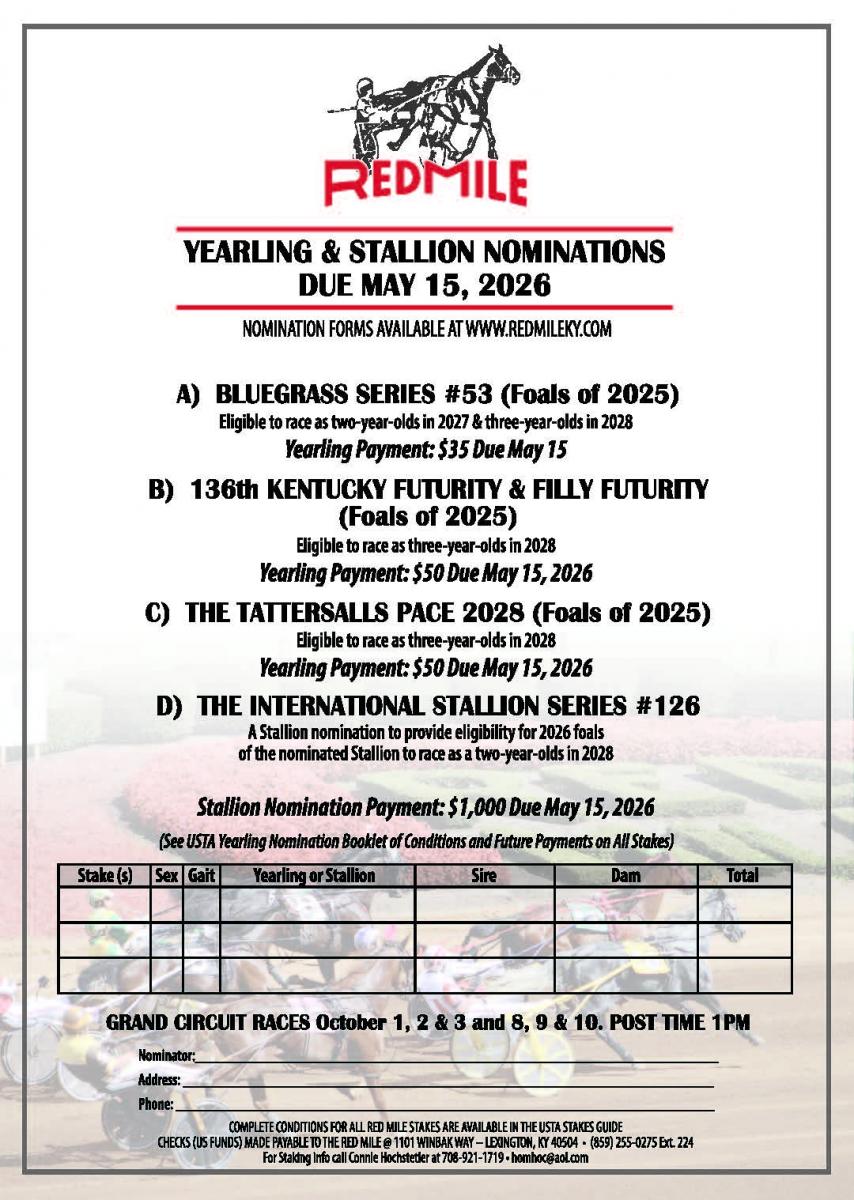 Yearling & Stallion Nominations - DUE MAY 15, 2026 Stakes Nomination Form 2025 Purse Authorization Form W8 Form W9 Form 2025 Red Mile Stall Application Form